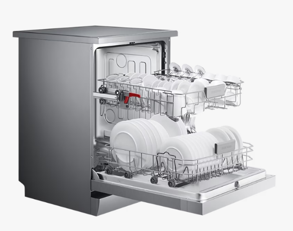 12인용 식기세척기 DW60A5055FS 모델은 고온 직수세척이 가능하며 자동 열림 건조 기능을 제공합니다.